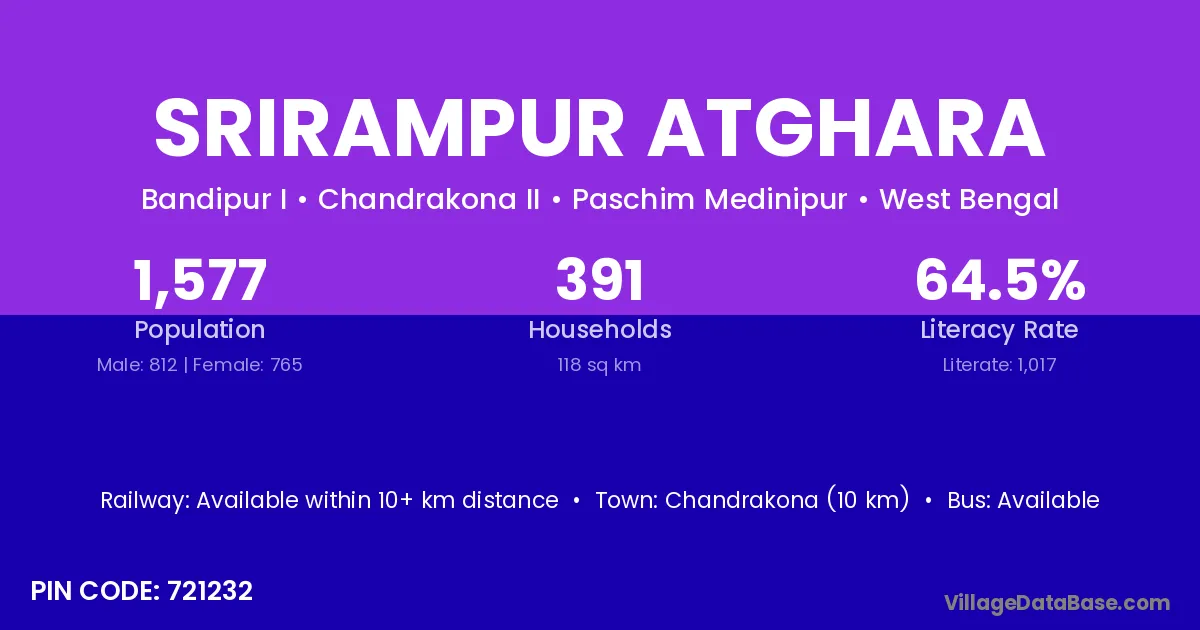 Chandrakona (10 km) is the nearest town to Srirampur Atghara village for major economic activities and is located approximately 10 km away.