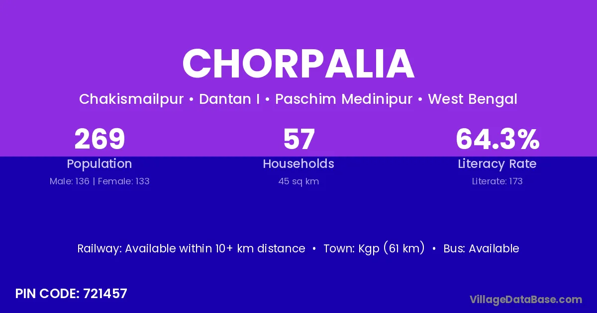 Kgp (61 km) is the nearest town to Chorpalia village for major economic activities and is located approximately 61 km away.