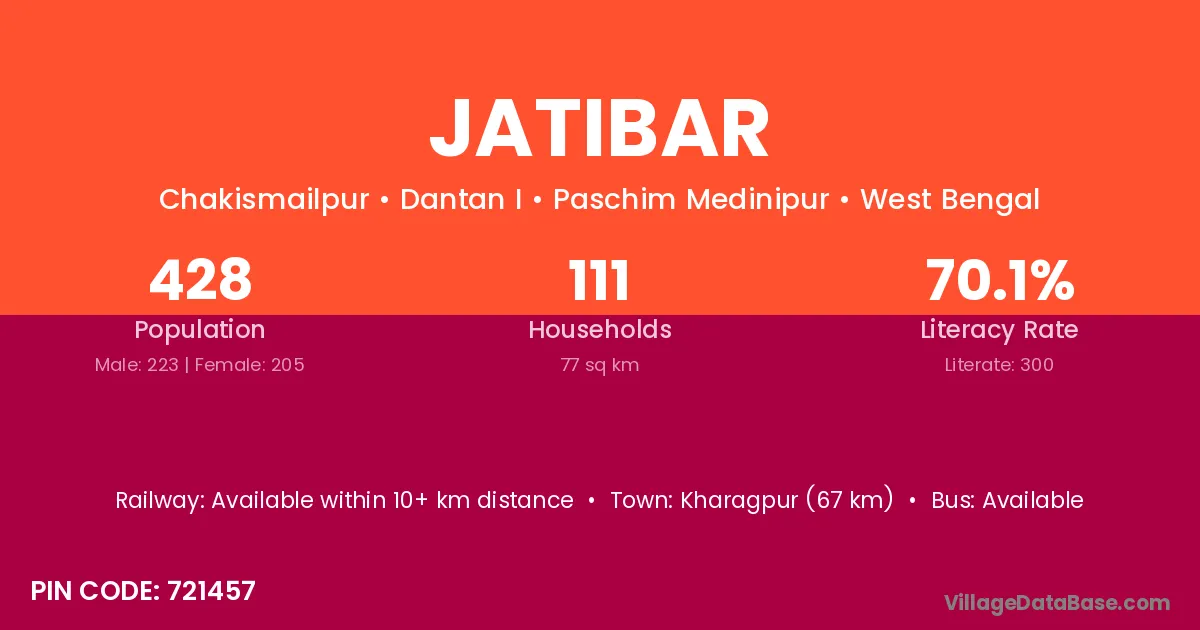 Kharagpur (67 km) is the nearest town to Jatibar village for major economic activities and is located approximately 67 km away.