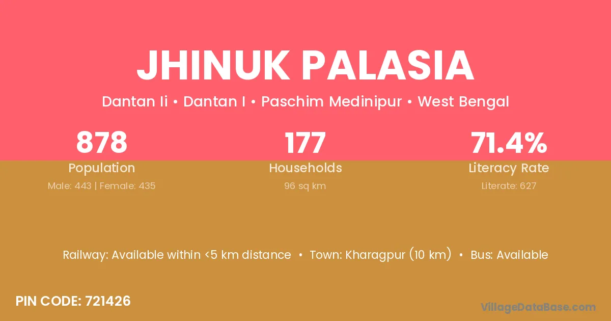 Kharagpur (10 km) is the nearest town to Jhinuk Palasia village for major economic activities and is located approximately 10 km away.