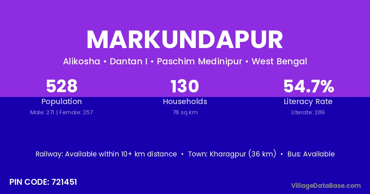 Kharagpur (36 km) is the nearest town to Markundapur village for major economic activities and is located approximately 36 km away.