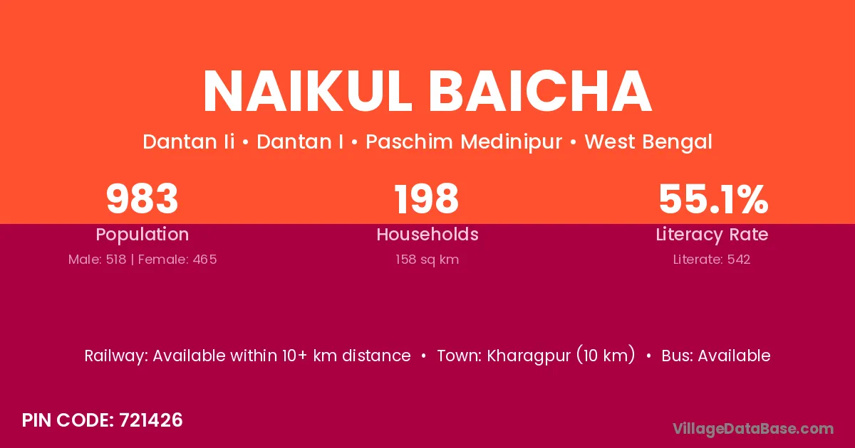 Kharagpur (10 km) is the nearest town to Naikul Baicha village for major economic activities and is located approximately 10 km away.