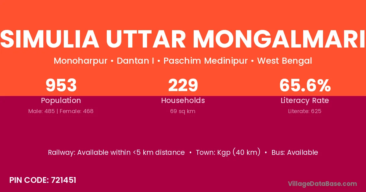 Kgp (40 km) is the nearest town to Simulia Uttar Mongalmari village for major economic activities and is located approximately 40 km away.