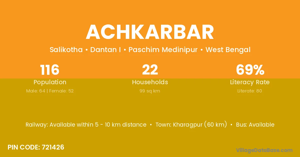 Kharagpur (60 km) is the nearest town to Achkarbar village for major economic activities and is located approximately 60 km away.