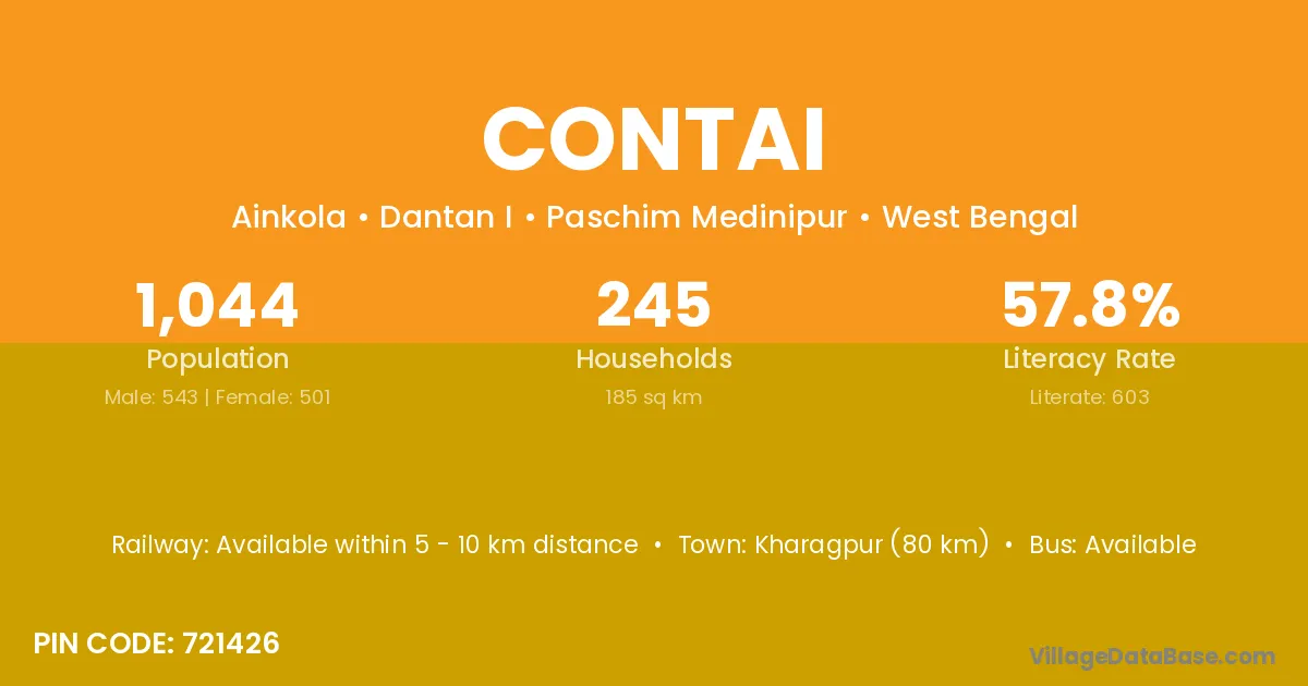 Kharagpur (80 km) is the nearest town to Contai village for major economic activities and is located approximately 80 km away.