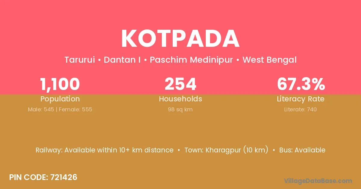 Kotpada village is located in the Dantan I Subdivision of the Paschim Medinipur district in West Bengal.