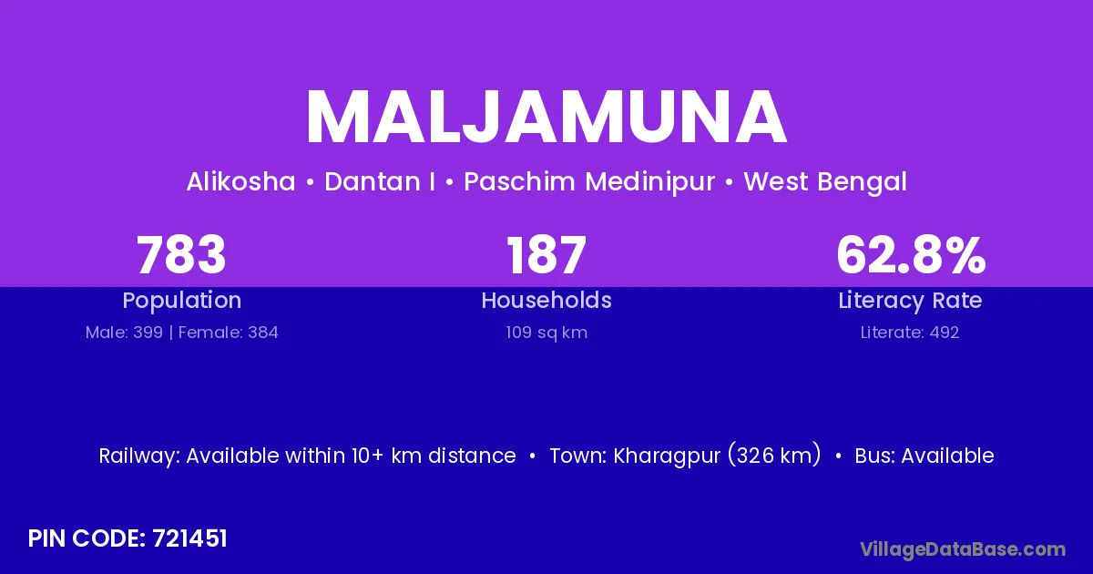 Kharagpur (326 km) is the nearest town to Maljamuna village for major economic activities and is located approximately 326 km away.