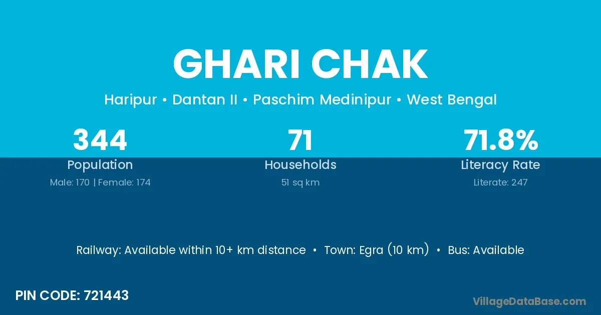 Egra (10 km) is the nearest town to Ghari Chak village for major economic activities and is located approximately 10 km away.