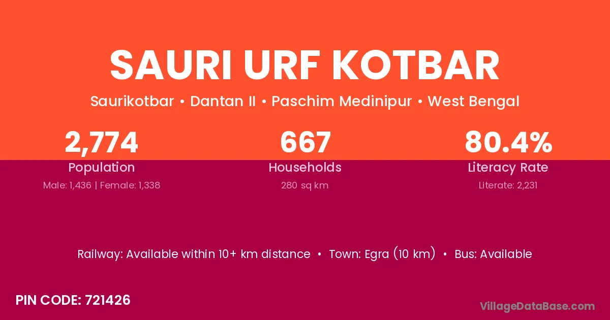Egra (10 km) is the nearest town to Sauri Urf Kotbar village for major economic activities and is located approximately 10 km away.