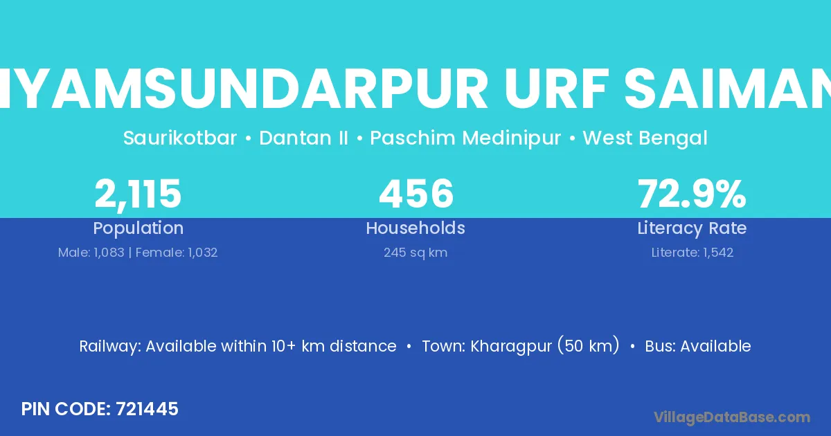 Kharagpur (50 km) is the nearest town to Shyamsundarpur Urf Saimana village for major economic activities and is located approximately 50 km away.