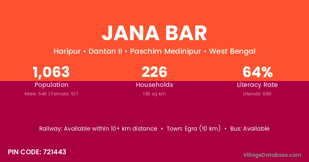 Egra (10 km) is the nearest town to Jana Bar village for major economic activities and is located approximately 10 km away.