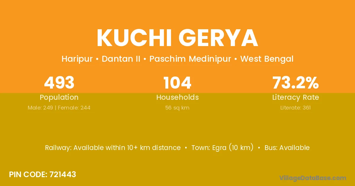 Egra (10 km) is the nearest town to Kuchi Gerya village for major economic activities and is located approximately 10 km away.