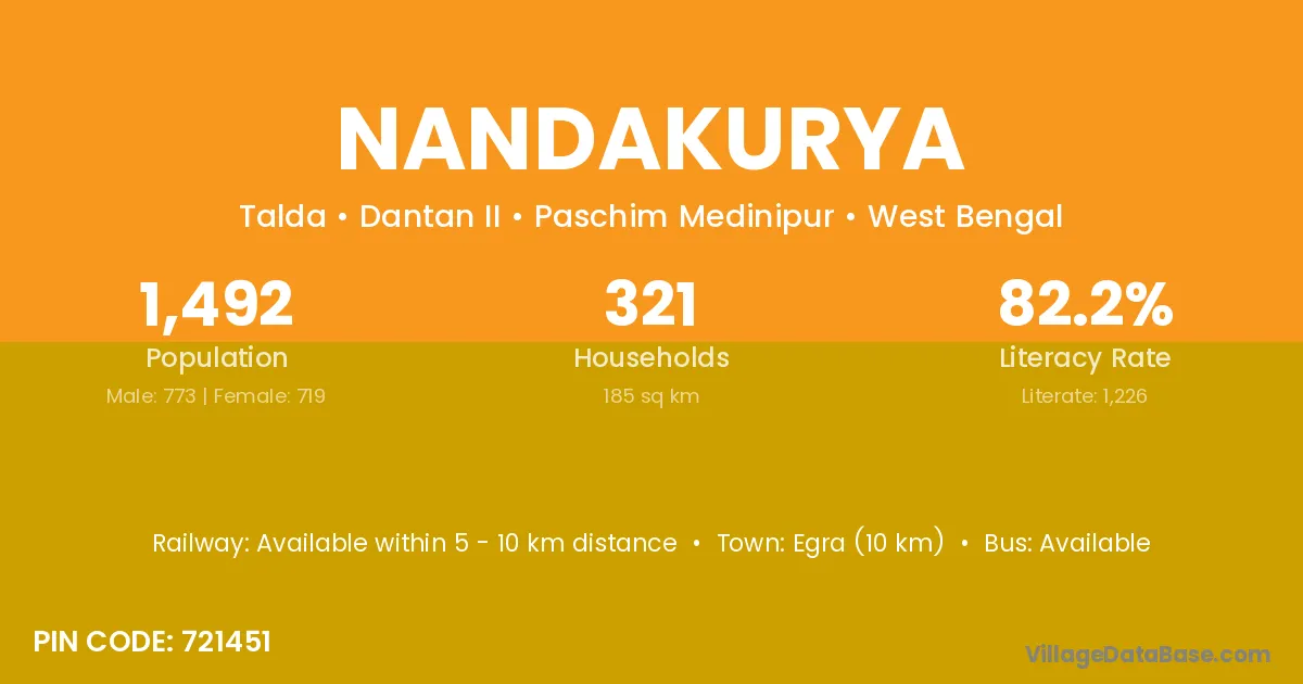 Egra (10 km) is the nearest town to Nandakurya village for major economic activities and is located approximately 10 km away.