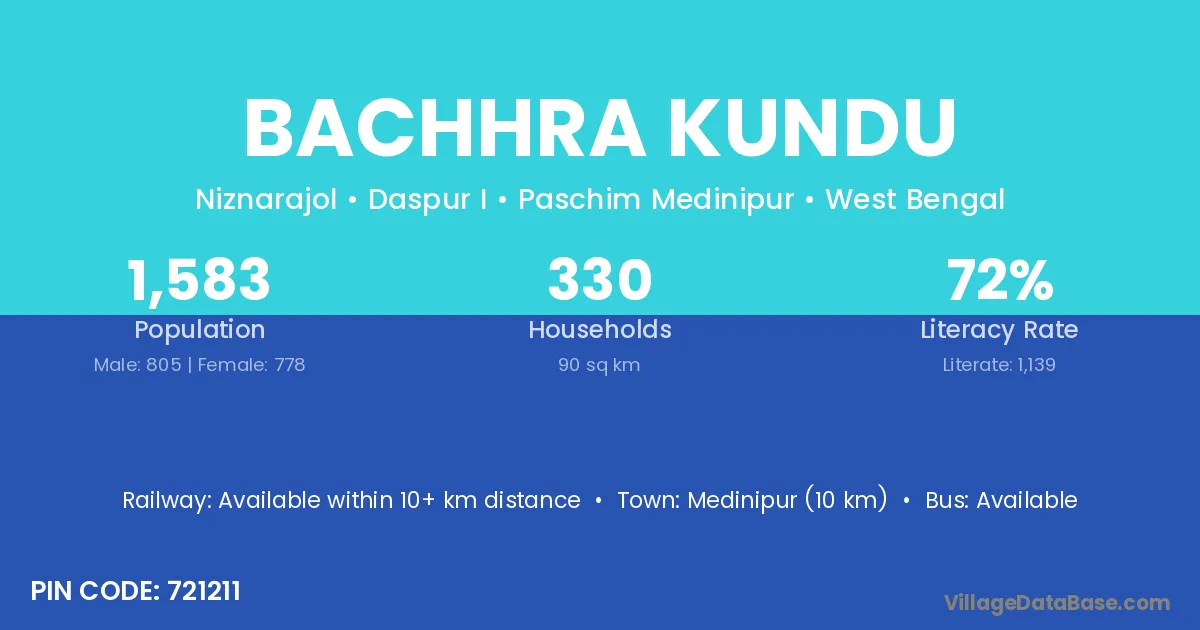 Medinipur (10 km) is the nearest town to Bachhra Kundu village for major economic activities and is located approximately 10 km away.