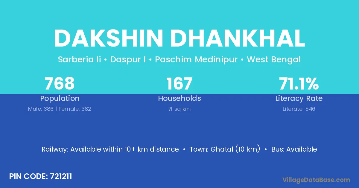 Ghatal (10 km) is the nearest town to Dakshin Dhankhal village for major economic activities and is located approximately 10 km away.