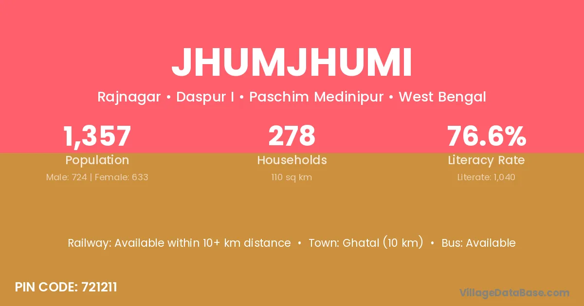 Ghatal (10 km) is the nearest town to Jhumjhumi village for major economic activities and is located approximately 10 km away.