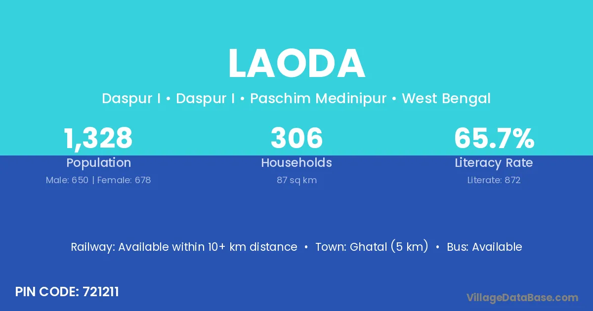 Ghatal (5 km) is the nearest town to Laoda village for major economic activities and is located approximately 5 km away.