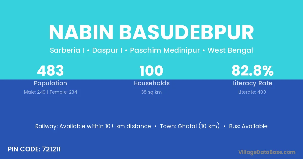 Ghatal (10 km) is the nearest town to Nabin Basudebpur village for major economic activities and is located approximately 10 km away.