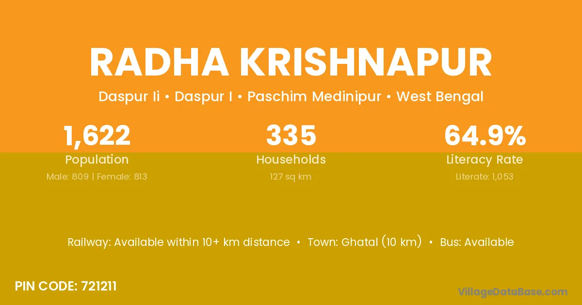 Ghatal (10 km) is the nearest town to Radha Krishnapur village for major economic activities and is located approximately 10 km away.
