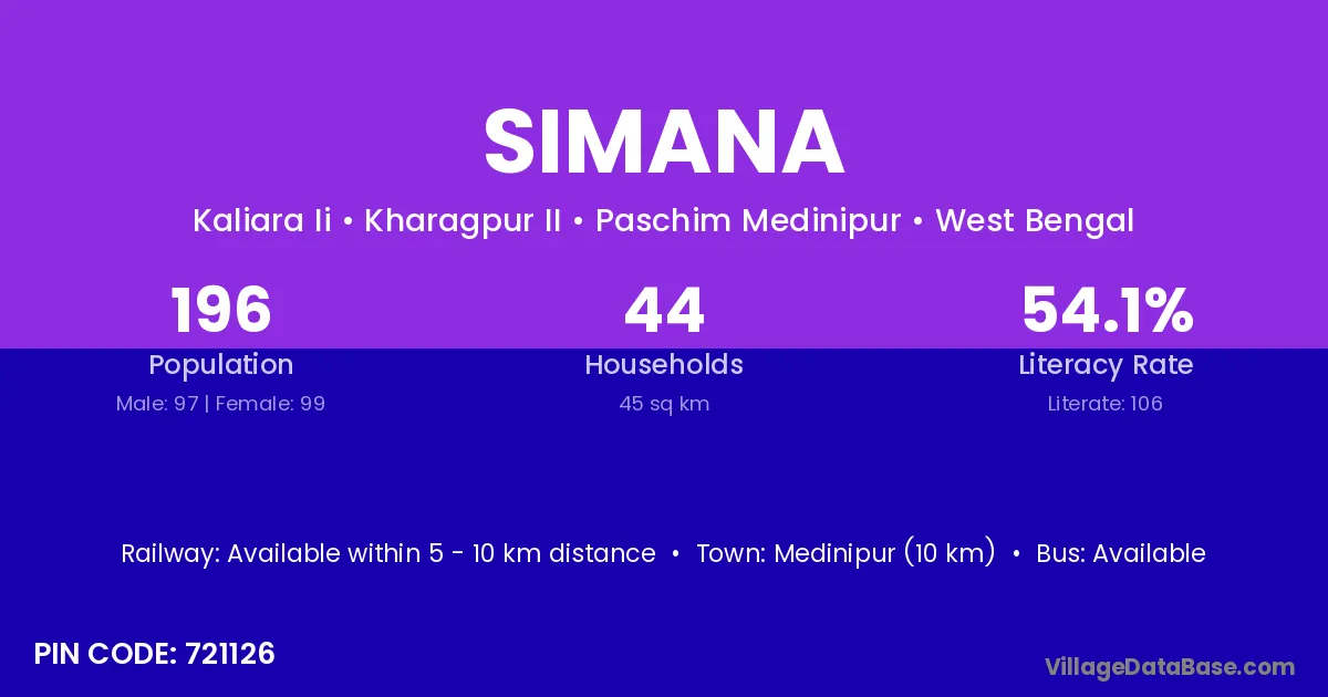 Medinipur (10 km) is the nearest town to Simana village for major economic activities and is located approximately 10 km away.