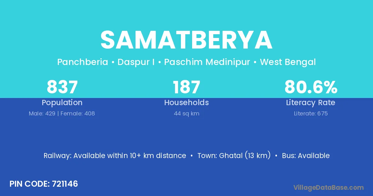 Ghatal (13 km) is the nearest town to Samatberya village for major economic activities and is located approximately 13 km away.