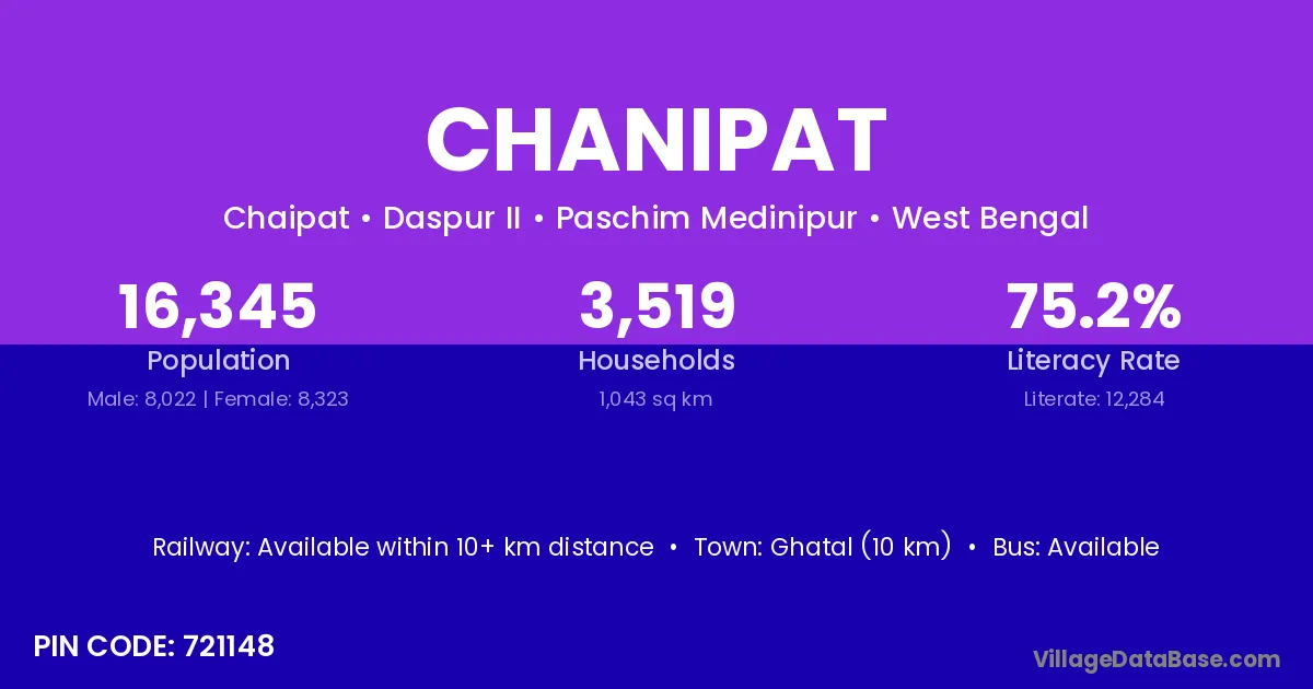 Ghatal (10 km) is the nearest town to Chanipat village for major economic activities and is located approximately 10 km away.