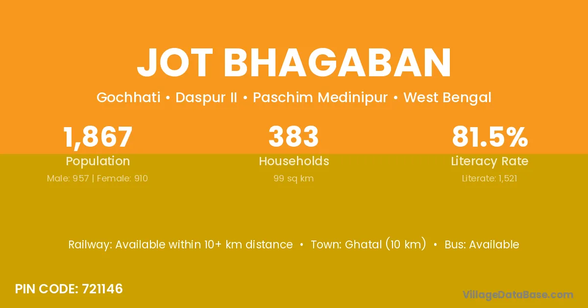 Ghatal (10 km) is the nearest town to Jot Bhagaban village for major economic activities and is located approximately 10 km away.