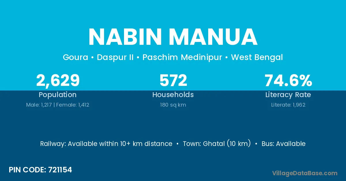 Ghatal (10 km) is the nearest town to Nabin Manua village for major economic activities and is located approximately 10 km away.