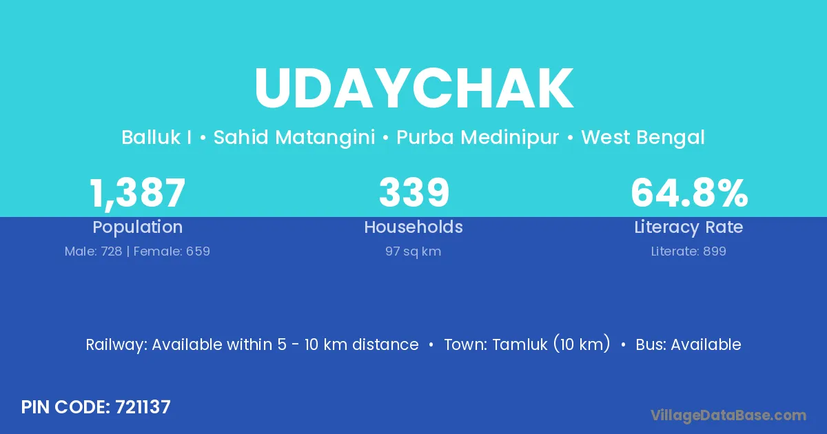 Ghatal (10 km) is the nearest town to Udaychak village for major economic activities and is located approximately 10 km away.