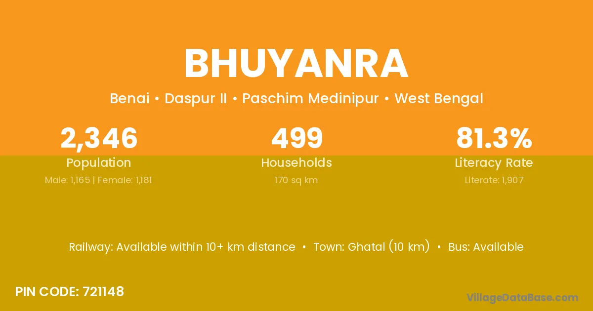 Ghatal (10 km) is the nearest town to Bhuyanra village for major economic activities and is located approximately 10 km away.