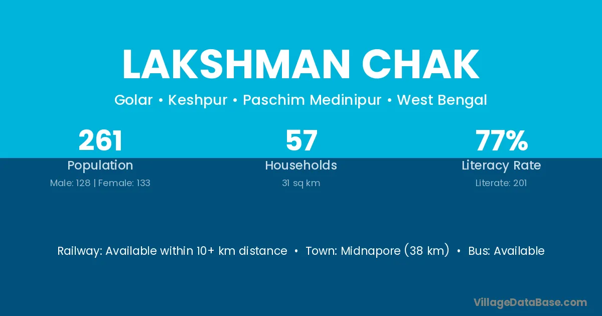 Ghatal (10 km) is the nearest town to Lakshman Chak village for major economic activities and is located approximately 10 km away.