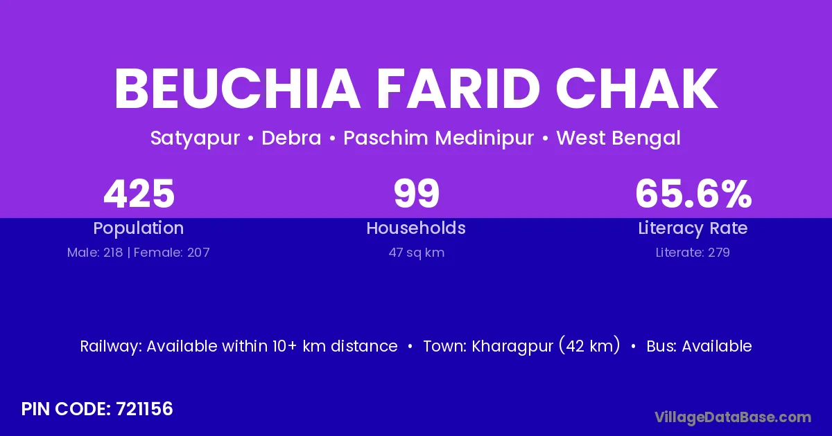 Kharagpur (42 km) is the nearest town to Beuchia Farid Chak village for major economic activities and is located approximately 42 km away.