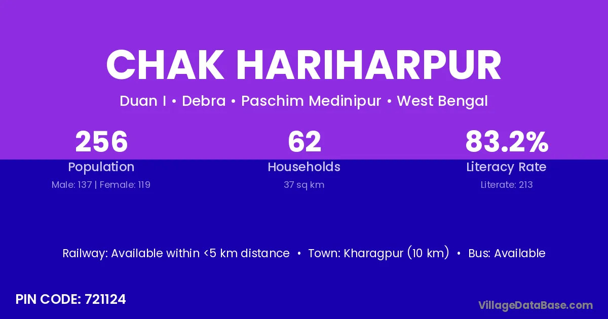 Kharagpur (10 km) is the nearest town to Chak Hariharpur village for major economic activities and is located approximately 10 km away.