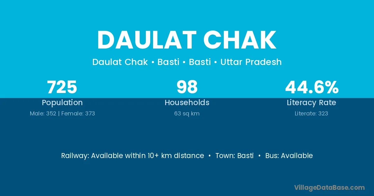 The literacy rate of Daulat Chak village is 89.97%. Male literacy stands at 90.12% and female literacy at 89.81%.