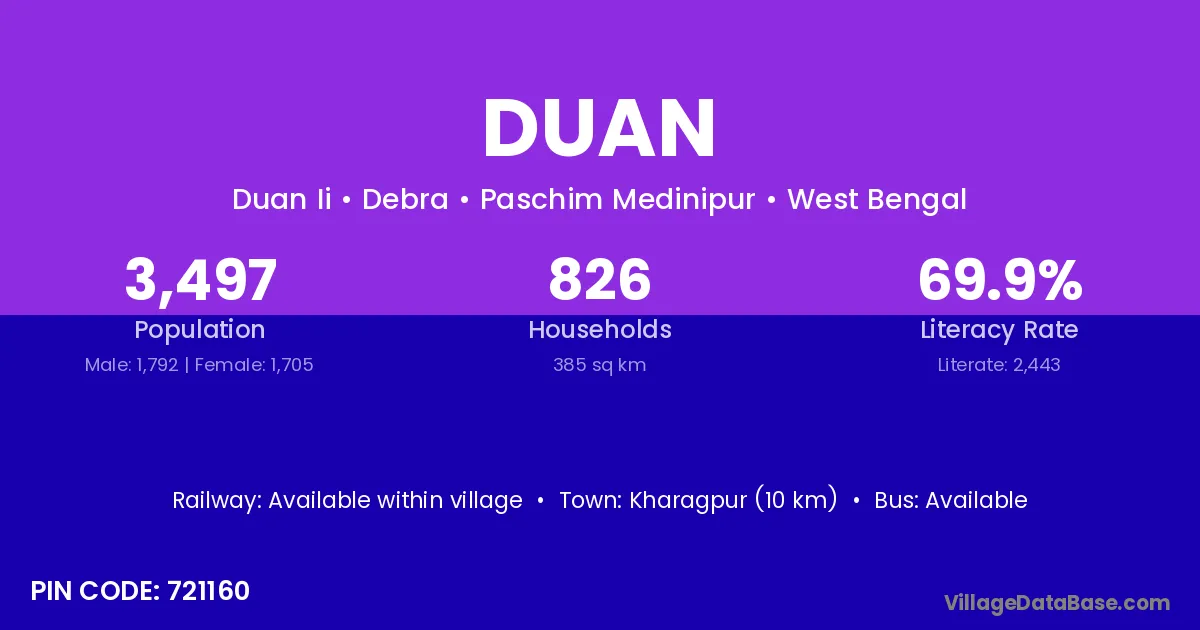 Kharagpur (10 km) is the nearest town to Duan village for major economic activities and is located approximately 10 km away.