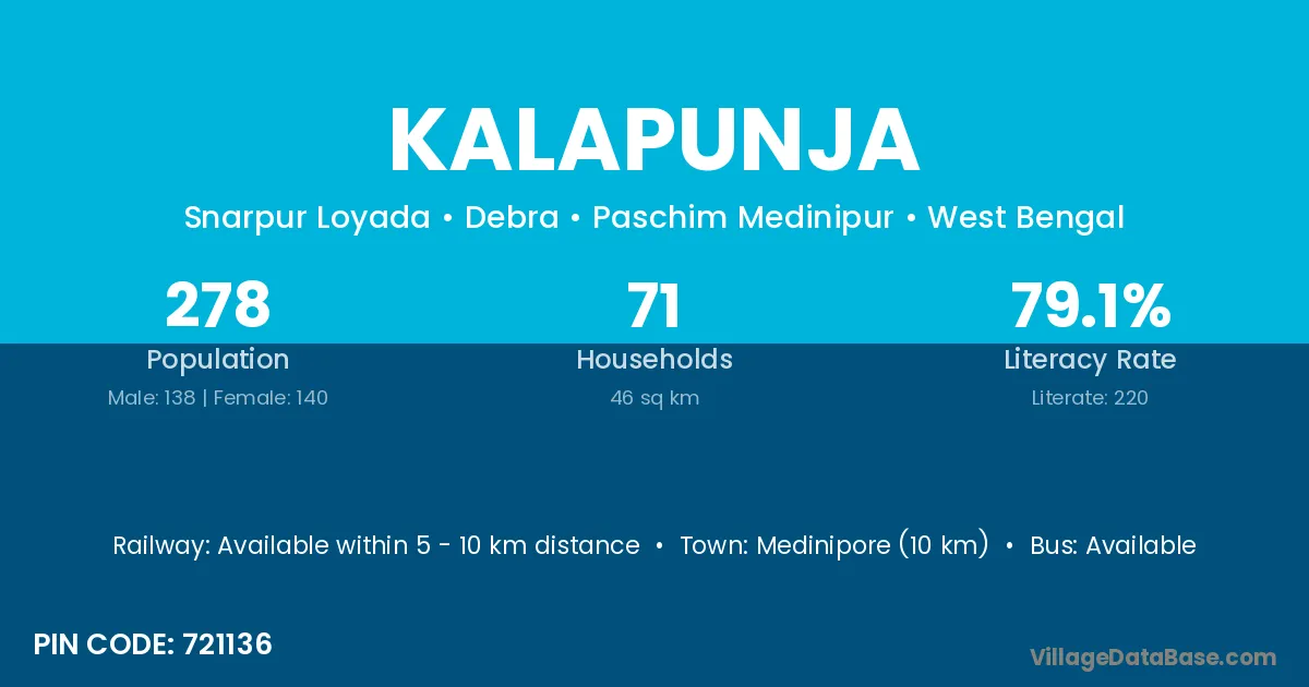 Medinipore (10 km) is the nearest town to Kalapunja village for major economic activities and is located approximately 10 km away.