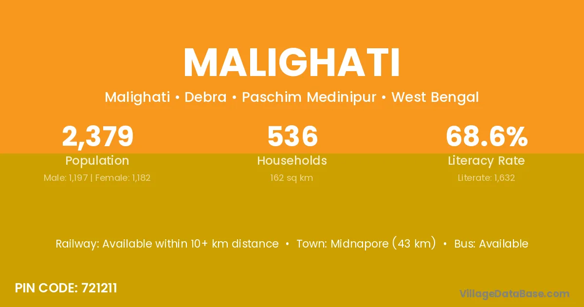 Midnapore (43 km) is the nearest town to Malighati village for major economic activities and is located approximately 43 km away.