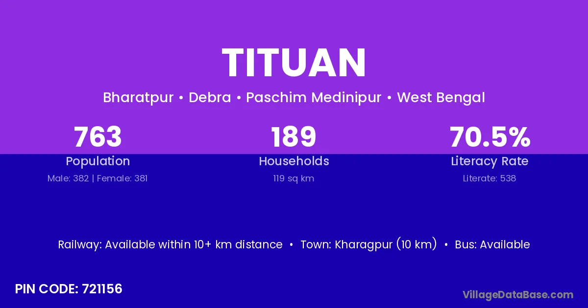 Kharagpur (10 km) is the nearest town to Tituan village for major economic activities and is located approximately 10 km away.