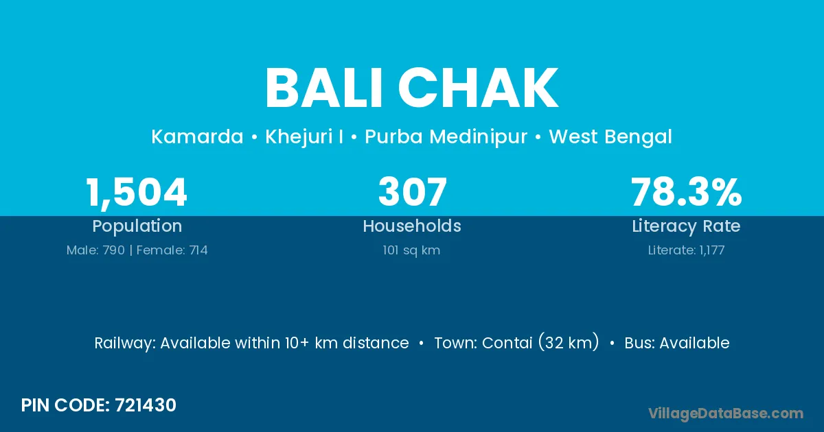 Kharagpur (20 km) is the nearest town to Bali Chak village for major economic activities and is located approximately 20 km away.