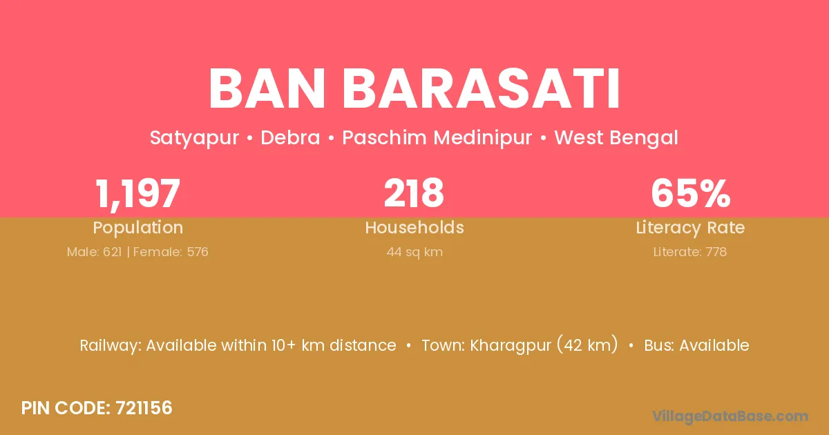 Kharagpur (42 km) is the nearest town to Ban Barasati village for major economic activities and is located approximately 42 km away.