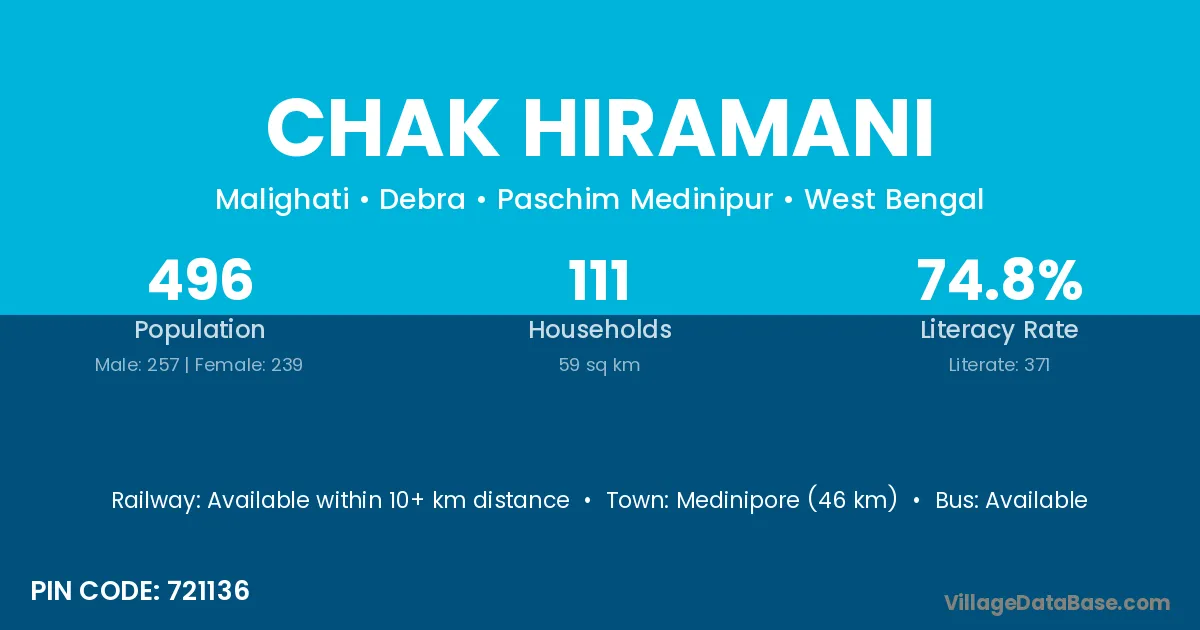 Medinipore (46 km) is the nearest town to Chak Hiramani village for major economic activities and is located approximately 46 km away.