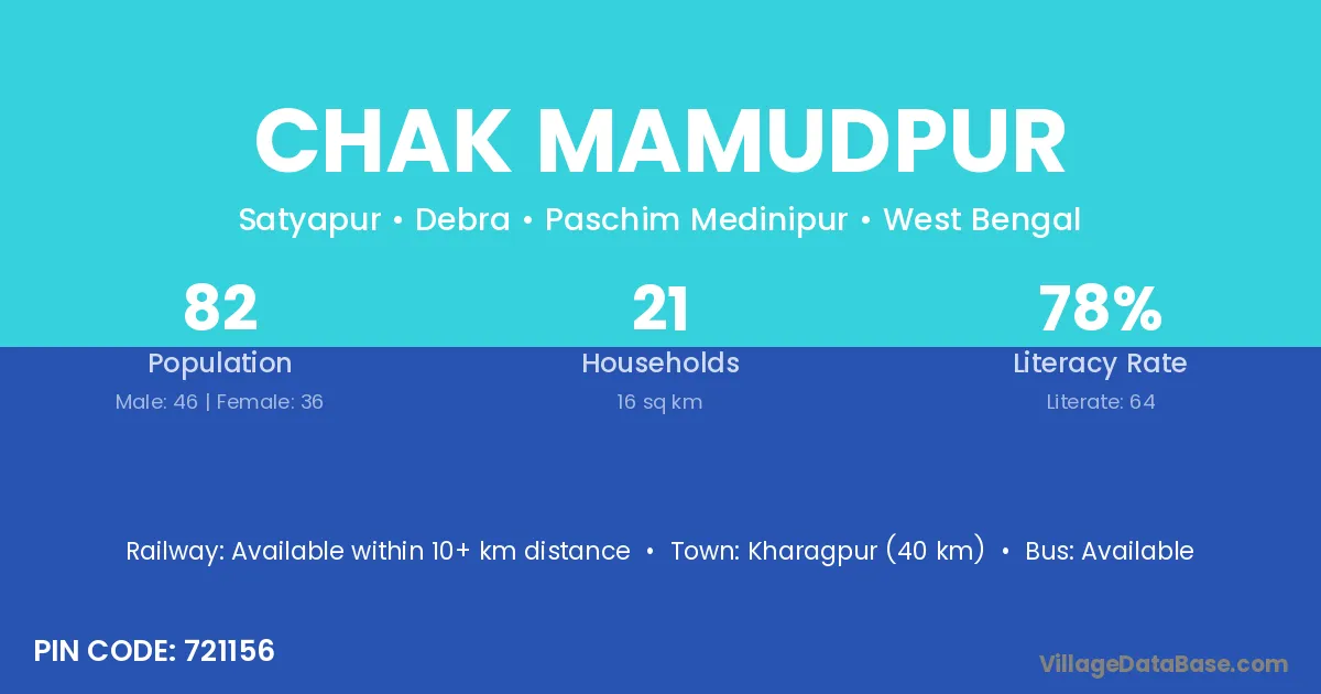 Kharagpur (40 km) is the nearest town to Chak Mamudpur village for major economic activities and is located approximately 40 km away.