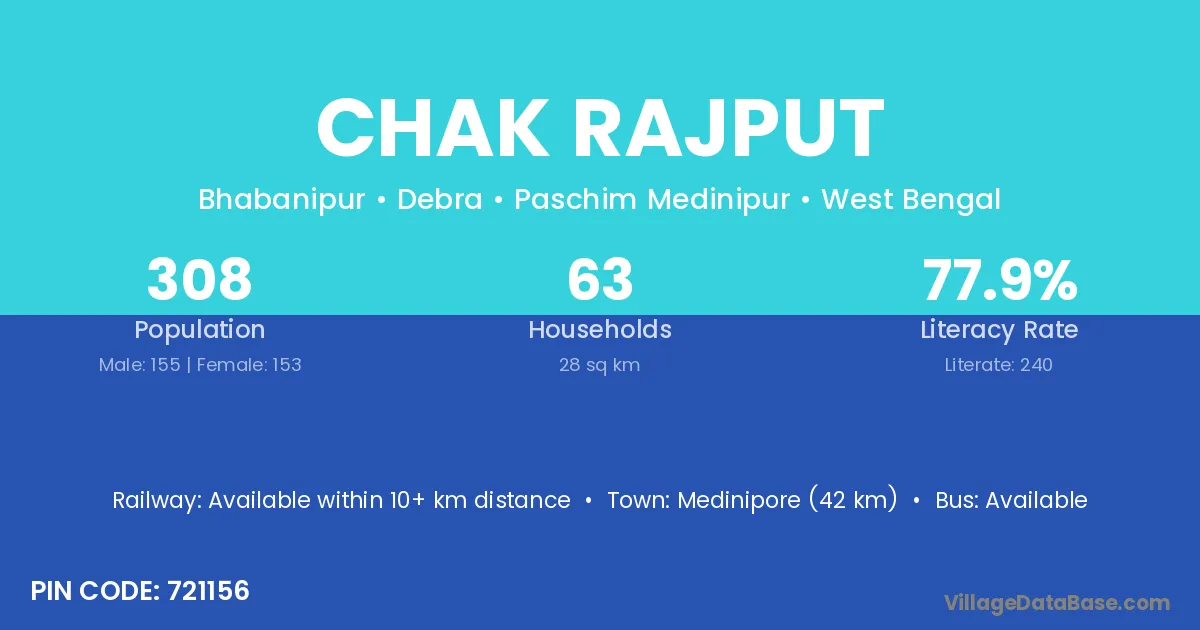 Medinipore (42 km) is the nearest town to Chak Rajput village for major economic activities and is located approximately 42 km away.