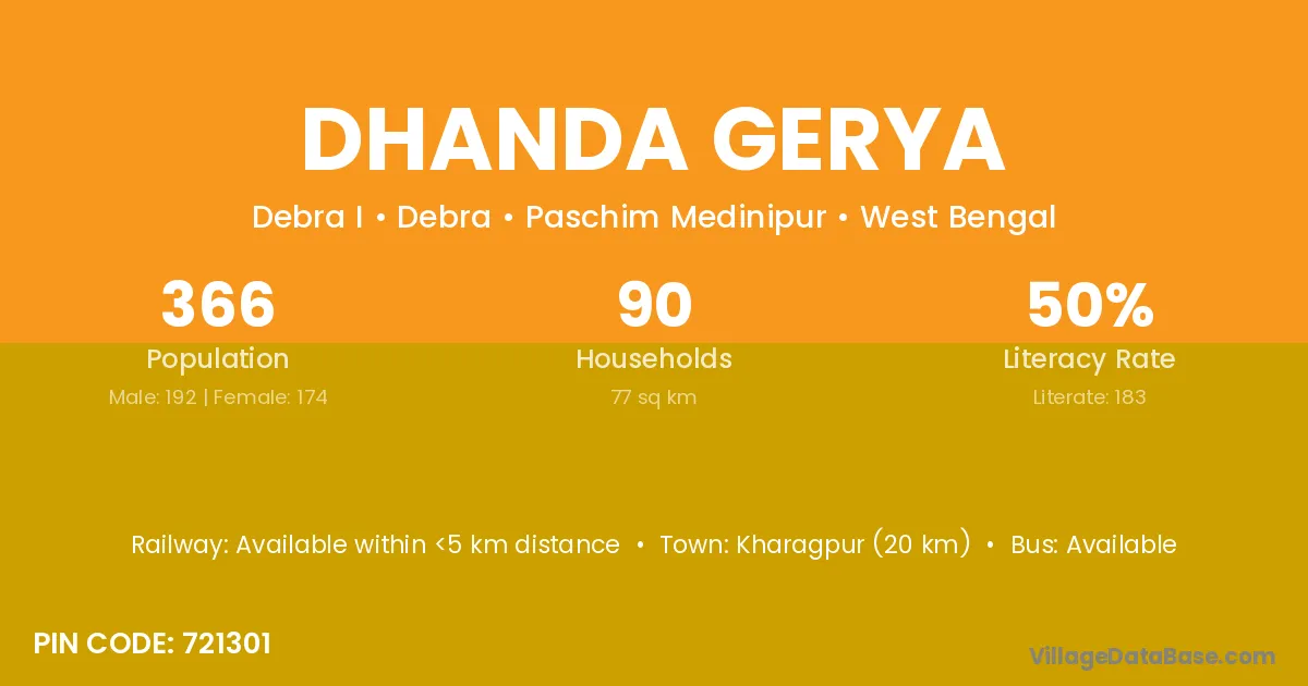 Kharagpur (20 km) is the nearest town to Dhanda Gerya village for major economic activities and is located approximately 20 km away.
