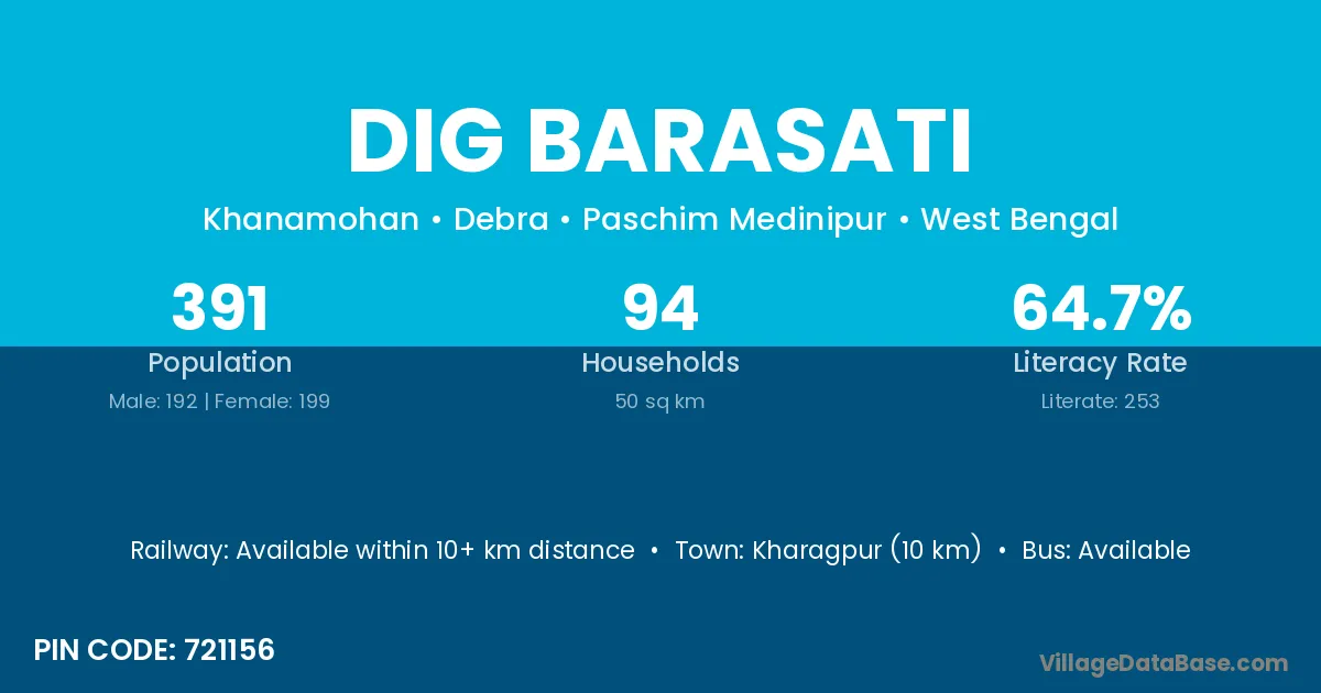 Kharagpur (10 km) is the nearest town to Dig Barasati village for major economic activities and is located approximately 10 km away.