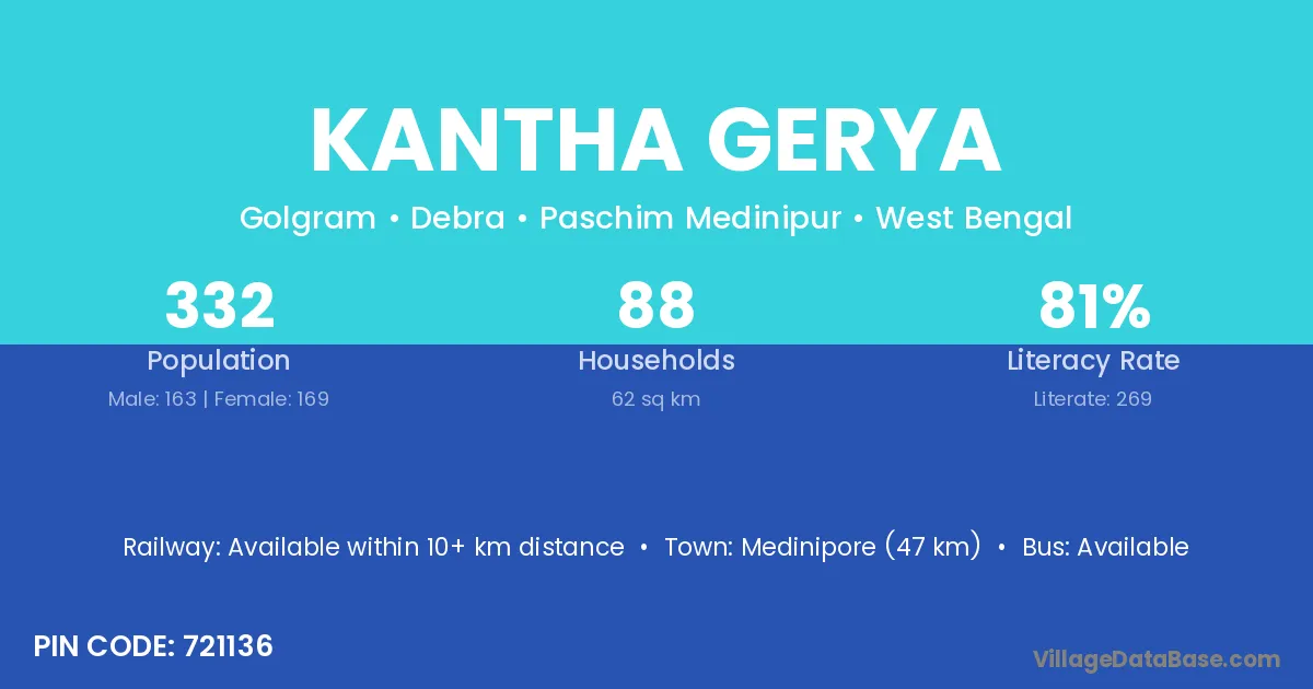 Medinipore (47 km) is the nearest town to Kantha Gerya village for major economic activities and is located approximately 47 km away.