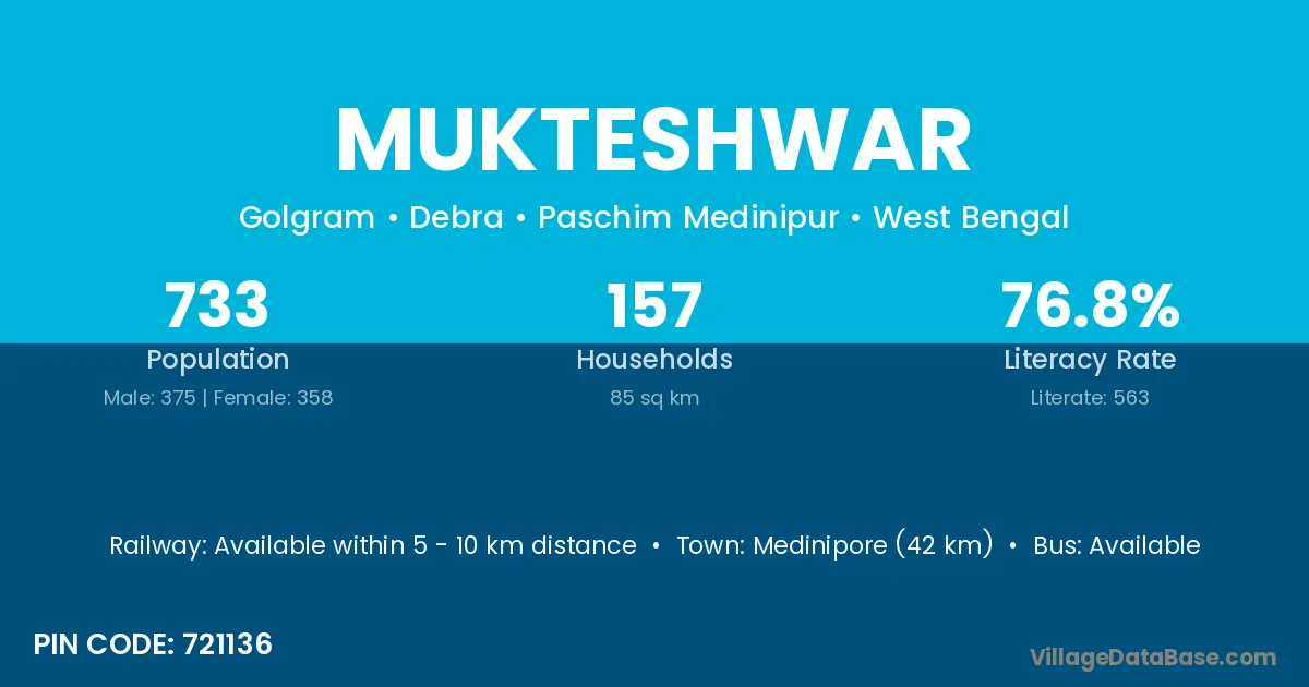 Medinipore (42 km) is the nearest town to Mukteshwar village for major economic activities and is located approximately 42 km away.