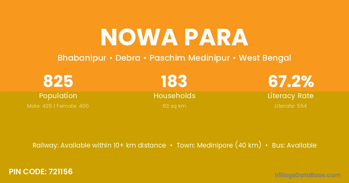Medinipore (40 km) is the nearest town to Nowa Para village for major economic activities and is located approximately 40 km away.