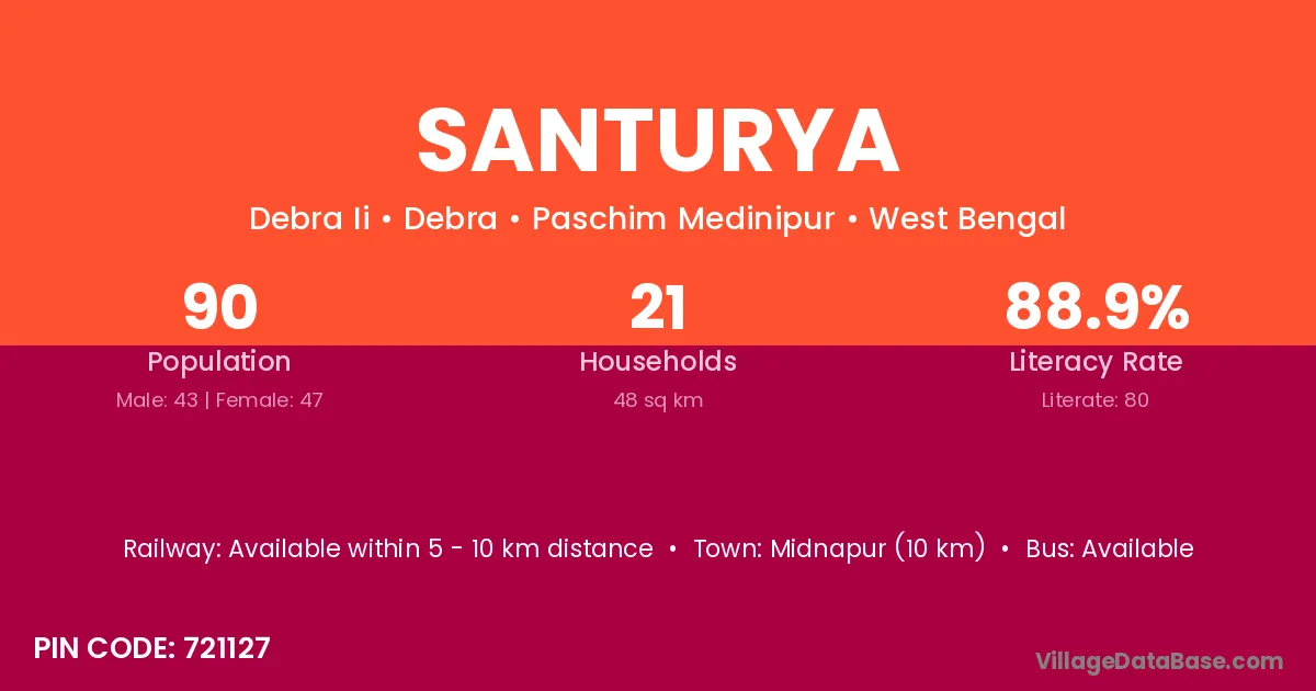 Midnapur (10 km) is the nearest town to Santurya village for major economic activities and is located approximately 10 km away.
