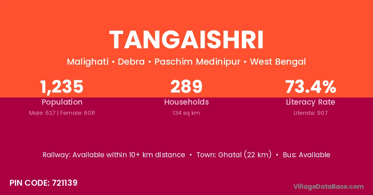 Ghatal (22 km) is the nearest town to Tangaishri village for major economic activities and is located approximately 22 km away.
